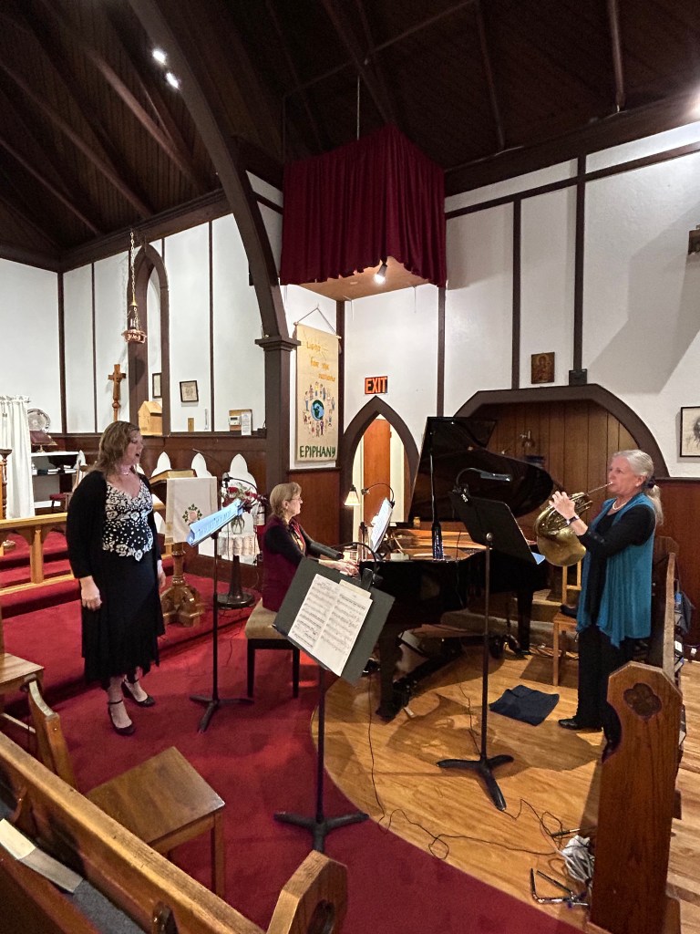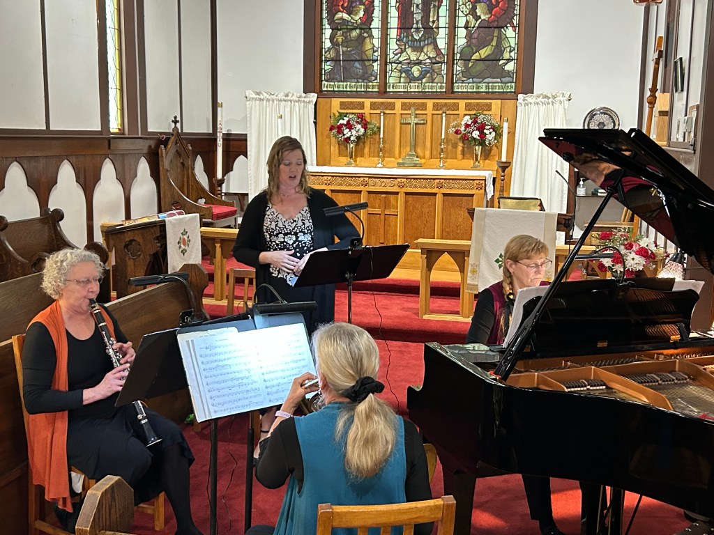 Forgetting all about the cold, wet weather, an appreciative audience was treated to a wonderful program of music for voice, piano, horn and clarinet this afternoon. Different combinations of and arrangements for the various instruments brought familiar works to life in a brand new way. Thanks to all who came out to listen, and to the KeyWinds Trio and guest soprano Kelly Coubrough.